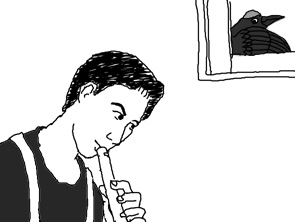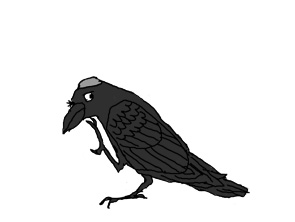 カラスに化けたまほう使いはさりげなく笛しょくにんの家のへいに