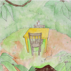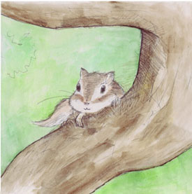 椅子の背もたれにリスが立っていて「さあここへ来て」と言う。