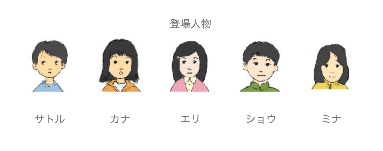 カナ、エリ、ショウ、ミナ、サトルが