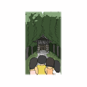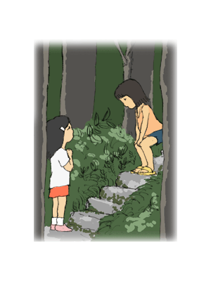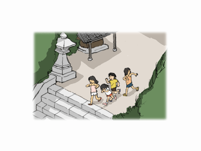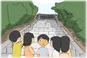 サトル「二人ずつでこの階段をずっとのぼって、お堂のところまで行ってお堂のうらまで行ったら、すごく大きな木があるからその木のうらへまわると、また細い階段があるんだ。そこをのぼるとまた小さなお堂があるから、そこでおまいりをして帰ってくるんだ。」